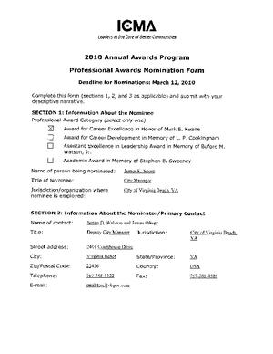 This is the 2010 nomination of James K. Spore for the Award for Career Excellence in Honor of Mark E. Keane. James Spore is the City Manager of Virginia Beach, Virginia and has been recognized for his leadership skills and downtown development projects.