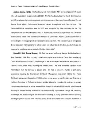 This is the 2010 nomination of Randall H. Reid for the Award for Career Excellence in Honor of Mark E. Keane. Randall Reid is the County Manager of Alachua County, Florida and has been recognized for his development of interactive citizen workshops regarding the county's financial decisions.