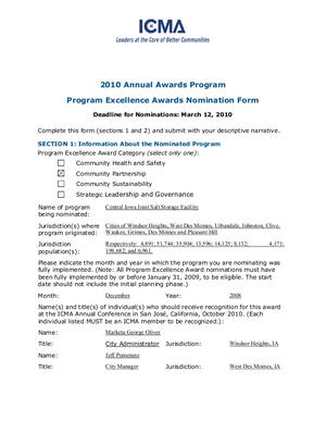 This is the 2010 nomination of Windsor Heights, Iowa, West Des Moines, Iowa, Urbandale, Iowa, Johnston, Iowa, Clive, Iowa, Waukee, Iowa, Grimes, Iowa, Des Moines, Iowa, and Pleasant Hill, Iowa's Joint Salt Storage Facility for the Community Partnership Award. City Managers Jeff Pomeranz, A.J. Johnson, Dennis Henderson, Jeff Koistra, Rick Clark, and Don Sandor, along with City Administrators Marketa George Oliver, Jim Sanders, and Kelly Brown are credited with aiding in the development of this program to counter the rising costs of rock salt. This storage facility ensures that these nine cities will have access to salt when it is needed to deal with winter storms and at a lower cost. In the first year of operation, this facility saved the cities $176,000 and in the second year saved $282,000.