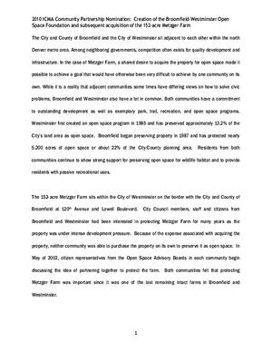 This is the 2010 nomination of the City and County of Broomfield, Colorado and Wesminster, Colorado's Creation of the Open Space Foundation and Subsequent Acquisition of the 152-acre Metzger Farm for the Community Partnership Award. City and County Manager George DiCiero and City Manager J. Brent McFall are credited with aiding in the development of this Foundation to structure the acquisition of Metzger Farm so that it would be jointly managed. This action meant that the Foundation could issue Certificates of Participation to finance the property, with each area paying annually towards this debt. The farm will be an asset to both communities as it provides a recreational area complete with hiking trails, bike paths, and picnic areas.