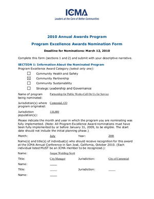 This is the 2010 nomination of Centennial, Colorado's Partnership for Public Works - Call On Us for Services program for the Community Partnership Award. City Manager Jacque Wedding-Scott is credited with aiding in the implementation of this 24-hour, seven-day-a-week call center that serves as a single point of contact for citizens. This program provides maximum responsiveness while tracking service requests and ensuring accountability. In order to satisfy customer service goals, the program strives to guarantee that 85 percent of all calls are answered within two minutes by a live representative.