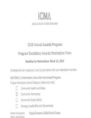 This is the 2010 nomination of Eau Claire, Wisconsin's Regional Emergency Medical Services Program for the Community Partnership Award. City Manager Mike Huggins is credited with the development of this program which coordinated a full integration of various partners working together to support a high level of medical care for the residents in the community. The result of this partnership has been a higher level of patient care, while providing an efficient delivery model. A specific measurable outcome has been the reduction of response times from 20 to 60 percent.