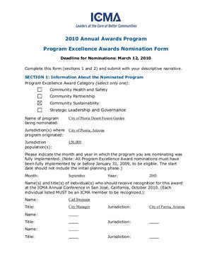This is the 2010 nomination of Peoria, Arizona's Desert Fusion Garden program for the Community Sustainability Award. City Manager Carl Swenson is credited with the development of this program that replaced the unused grass area in front of city hall with low water use landscaping called Xeriscape. This area uses a variety of plants to educate the public about the benefits and versatility of low water use landscapes. The overall goal of this program is to promote water conservation while extending current and future water supplies.