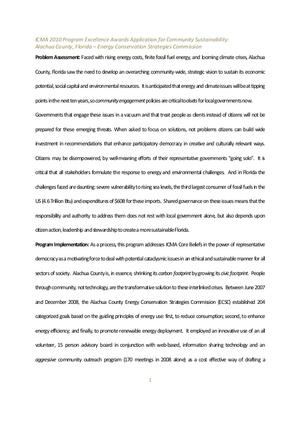 This is the 2010 nomination of Alachua County, Florida's Energy Conservation Strategies Commission (ECSC) for the Community Sustainability Award. County Manager Randall H. Reid is credited with developing this commission to address the County's growing ecological footprint. The ECSC established over 200 goals based on their guiding principles of energy use: reduce consumption, enhance energy efficiency, and promote renewable energy deployment. Based on ECSC conservation recommendations for County operations, utility consumption was estimated to be reduced by 30% by the end of 2010. Additionally, over the 15 year life of the proposed residential upgrades, 150,000 tons of CO2e would be eliminated from 6,000 low income households.
