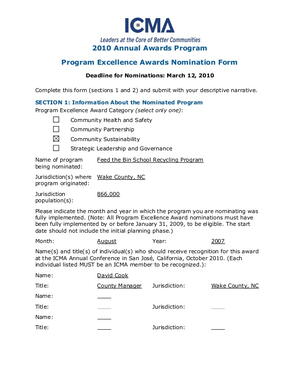 This is the 2010 nomination of Wake County, North Carolina's Feed the Bin School Recycling Program for the Community Sustainability Award. County Manager David Cook is credited with creating this program which funds mixed paper recycling at Wake County public schools. Not only does this program actively engage students in recycling, but it also provides complimentary education resources for students and teachers. As a result of the implementation of this program, 1,000 cubic yards of the County's local landfill have been saved.