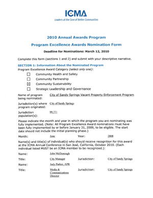 This is the 2010 nomination of Sandy Springs, Georgia's Vacant Property Enforcement Program (VPEP) for the Community Sustainability Award. City Manager John McDonough and Media & Communications Director Judy Parker are credited with developing a systematic inspection program to enforce codes regarding vacant properties to deter future crime.