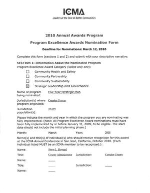This is the 2010 nomination of Camden County's Five Year Strategic Plan for the Strategic Leadership and Governance Award. County Administrator Steve L. Howard, along with the Strategic Planning Committee, developed a plan to address key focus areas in order to make progressive and innovative changes in their county.