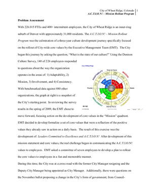 The City of Wheat Ridge, Colorado, found the state of its employee culture lacking. Management decided to focus on promoting core values related to the mission of the government, and deployed a committee of employees to communicate these values in memorable ways. These included fun logos in emails and on posters, videos, and meetings.