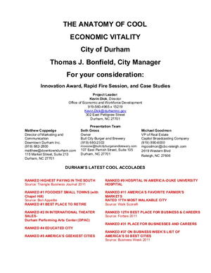 Durham, NC has used public-private partnerships and unique funding mechanisms to promote economic sustainability through: small business development, entrepreneurial incubation, and job creation and placement. The city has developed 5 strategic goals, one of which includes having a Strong and Diverse Community. The city supports this goal by collaborating with other organizations to provide grants that would aid the efforts of small developers and property owners seeking to revitalize vacant and underutilized buildings, as well as providing a way for small businesses to access capital for their expansion needs.