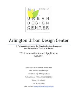 The Arlington Urban Design Center (AUDC) was established in July 2009 to create public awareness about the importance of sustainable urban design and its impact on quality of life, the environment, and economic investment. The City of Arlington is experiencing a significant amount of development activity, primarily due to the opening of the new Cowboys Stadium, the success of the Texas Rangers, the expansion of the University of Texas at Arlington, and the selection of Arlington as the site for Super Bowl 2011. In order to capitalize on this surge of reinvestment of the City’s Community Development and Planning Department collaborated with the University of Texas (UTA) School of Urban and Planning Affairs to create a unique studio staffed with six graduate students studying architecture, landscaping, and urban planning. Directed by City employees, the AUDC strives to provide high-quality urban design solutions at no cost to its clients.