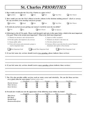 This survey, sent to St. Charles, Illinois, residents in 2003, attempts to capture public opinion on the importance of various city services as well as satisfaction with current service delivery--in the areas of fire, community and economic development, transportation, police, and general services. Asks residents to rate the relative importance of various city goals, as well as prioritize services provided through each revenue source.