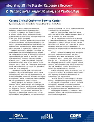 Description of the roles, responsibilities, and operating procedures utilized during emergency management contingencies by the City of Corpus Christi, Texas’ Customer Service Center (311). Employees at the Customer Service Center are assigned to one of five shifts, with five or six employees per shift. The Customer Service Center manager and Information Technology security manager assume a supervisory role, directing the city website during emergencies. Updates are provided to the CSC manager during an emergency, from the fire department’s Office of Emergency Management through a system called Web EOC. Choosing a primary location to consolidate 311 emergency functions continues to be a challenge.