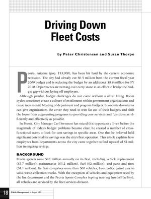 Faced with deep budget cuts in 2009 and 2010, Peoria, Arizona city staff examined the organization’s services and expenses, looking for additional savings. By developing 21 recommendations to reduce fleet costs, they were able to find a million dollars in costs savings starting in 2010. These recommendations include vehicle use, vehicle replacement, vehicle standards, service delivery, and cost allocation.