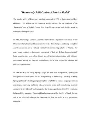 The City of Dunwoody, GA created a government framework for the provision of services called the, “Split Contract Service Model”. Their model centers on the use of three different contract vendors who provide all of the City’s services (except for public safety). The three firms work together on a board called, “Team Dunwoody” to streamline and collaborate on the work they do for the city. This model has helped bring in revenue and save money in every department.