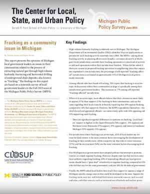 This report presents the opinions of Michigan local government leaders on issues in their communities related to the process of extracting natural gas through high-volume hydraulic fracturing and horizontal drilling of underground shale deposits, also known as “fracking.” The findings in this report are based on a statewide survey of local government leaders in the Fall 2013 wave of the Michigan Public Policy Survey (MPPS).