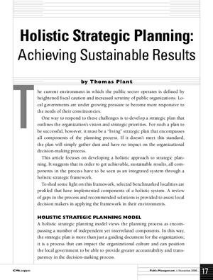The current environment in which the public sector operates is defined by heightened fiscal caution and increased scrutiny of public organizations. Local governments are under growing pressure to become more responsive to the needs of their constituencies. This article focuses on developing a holistic approach to strategic planning. It suggests that in order to get achievable, sustainable results, all components in the process have to be seen as an integrated system through a holistic strategic framework.