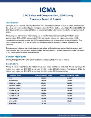 Topics covered in this survey include base annual salary, additional compensation, health insurance and other benefits, and compensation decision making and transparency. ICMA is pleased to provide the results of this survey as an exclusive member benefit.