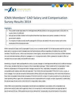 For the last several years ICMA’s annual salary and compensation survey has been sent to local government managers and chief administrative officers regardless of whether they are ICMA members. Starting this year, the survey is a member-only survey. The online survey covered salary and compensation, as well as employment agreements, severance pay, vacation, sick leave, retirement and other benefits. ICMA members have access to detailed results including tables showing the mean, median, minimum and maximum salaries presented by population size within each state.