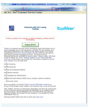 San Francisco’s 311 Call Center is connected with Twitter. This service allows the residents of San Francisco to “Tweet” or send a text message to the 311 call center, reporting about non-emergency municipal services such as street cleaning, potholes, abandoned vehicles, garbage collection, graffiti removal, and inquiries about City Hall hours, phone numbers, and departments.