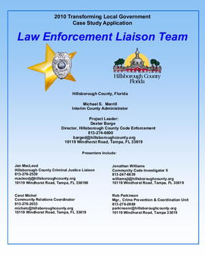 The grant saved five positions within Hillsborough County Code Enforcement, strengthened the anti-gang task force, assists law enforcement, and enhanced the community’s crime fighting toolbox at the same time. It was an innovative approach to gang awareness while not taxing the already over-burdened County budget. It is a “win-win-win”: Code Enforcement efforts and resources are reinforced; law enforcement results are heightened; and citizens gain a safer environment.