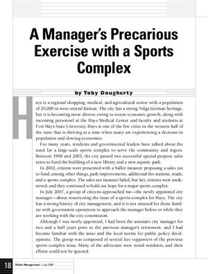 The author describes the construction of a city-run sports complex and reviews his role in the project as the city manager. Explains that the sports complex, backed by city residents, was opposed by the city commission. Illustrates how the citizens got their sports complex and the challenges behind the project. Provides lessons about citizen engagement, misconceptions about grassroots efforts, and a city manager’s role during these situations.