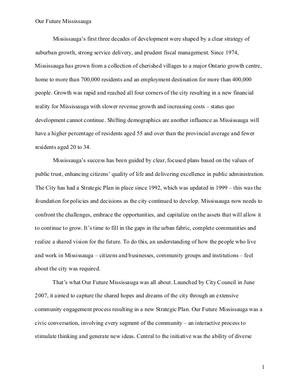 The Our Future Mississauga, Ontario program was created as a way to help develop the community as a whole. Changes were implemented in 5 distinct phases. The plan was also developed with rigorous input from residents in the community who participated in interviews, 110 community meetings, and shared their opinions on an interactive website.