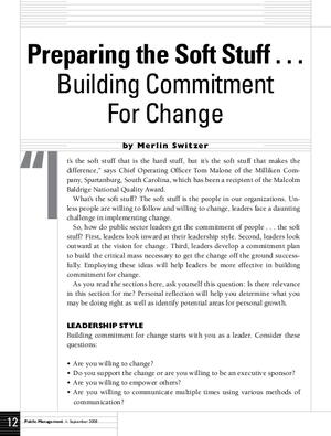 It’s the soft stuff that is the hard stuff, but it’s the soft stuff that makes the difference,” says Chief Operating Officer Tom Malone of the Milliken Company, Spartanburg, South Carolina, which has been a recipient of the Malcolm Baldrige National Quality Award. What’s the soft stuff? The soft stuff is the people in our organizations. Unless people are willing to follow and willing to change, leaders face a daunting challenge in implementing change.