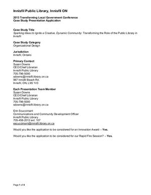 The future of public libraries is uncertain as they are faced with many challenges, including relevance in our technologically advanced society and threats to budgets. With these realities in mind, the Innisfil Public Library (IPL) embarked on a Strategic Planning Process in the fall of 2011. On the heels of the