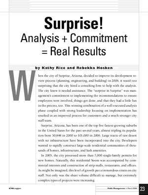 When the city of Surprise, Arizona, decided to improve its development review process (planning, engineering, and building) in 2006, it wasn’t too surprising that the city hired a consulting firm to help with the analysis. The “surprise in Surprise” was management’s commitment to implementing the recommendations to ensure employees were involved and that things got done. This winning combination of a well-executed analysis phase coupled with strong leadership focusing on implementation has resulted in an improved process for customers and a much stronger city staff team.