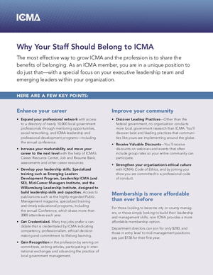 The most effective way to grow ICMA and the profession is to share the benefits of belonging. As an ICMA member, you are in a unique position to do just that—with a special focus on your executive leadership team and emerging leaders within your organization.