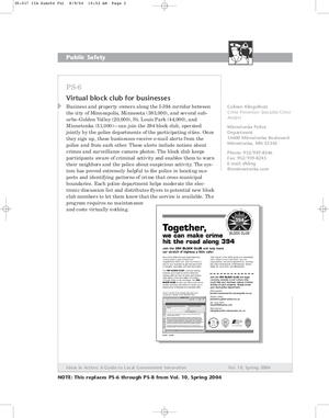 Business and property owners along the I-394 corridor between the city of Minneapolis, Minnesota (383,000), and several suburbs–Golden Valley (20,000), St. Louis Park (44,000), and Minnetonka (51,000)—can join the 394 block club, operated jointly by the police departments of the participating cities. Once they sign up, these businesses receive e-mail alerts from the police and from each other. These alerts include notices about crimes and surveillance camera photos. The block club keeps participants aware of criminal activity and enables them to warn their neighbors and the police about suspicious activity. The system has proved extremely helpful to the police in locating suspects and identifying patterns of crime that cross municipal boundaries. Each police department helps moderate the electronic discussion list and distributes flyers to potential new block club members to let them know that the service is available. The program requires no maintenance and costs virtually nothing. Colleen Klingelhutz Crime Prevention Specialist/Crime Analyst Minnetonka Police Department 14600 Minnetonka Boulevard Minnetonka, MN 55345 Phone: 952/939-8546 Fax: 952/939-8245 E-mail: dkling @eminnetonka.com