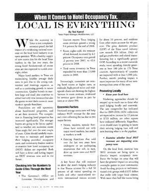 The article lists the ways municipalities can partner with hotels to improve their occupancy rates and also shows how communities can better monitor hotel occupancy tax revenues. Suggests that municipalities need to study and know the hotels in their jurisdiction, determine if HOT revenues affect occupancy rates, and market local events to increase occupancy rates.