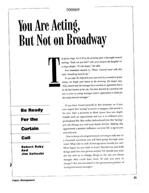 This article examines the role of the acting local government manager. Provides a number of practical steps that an interim manager should take in negotiating a temporary contract, dealing with employees and citizens, and management decisions. Includes suggestions on the decision to become a candidate for the permanent position or transition back to a former position.