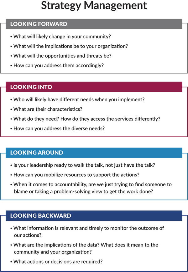 Strategy management evolved from strategic planning, which was brought to public sector organizations in the 1980s from the best-run private companies.1 Fast forward to where we are today: the times are uncertain and volatile and the intensity of conversation around strategy in the context of global forces is very high. It has become quite clear that the current environment where public organizations operate differs vastly from that of 40 years ago. Organizations need tools to better understand the needs of the community and the world around us, and to better deal with complex issues and meet community expectations. And we have to do all of that with increasingly constrained financial resources and move the entire organization in one direction.