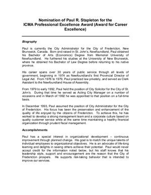 This is the 2010 nomination of Paul R. Stapleton for the Award for Career Excellence in Honor of Mark E. Keane. Paul Stapleton is the City Administrator of the City of Fredericton, New Brunswick, Canada and has been recognized for his passion for organizational development and sustainability practices.