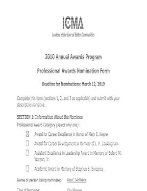 This is the 2010 nomination of Rita C. McMahon for the Award for Career Excellence in Honor of Mark E. Keane. Rita McMahon is the City Manager of Painesville, Ohio and has been recognized for her many accomplishments in her development of the Painesville Economic Strategic Plan.