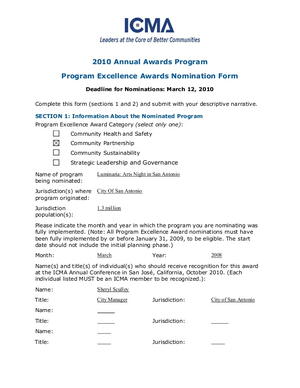 This is the 2010 nomination of San Antonio, Texas' Luminaria - Arts Night in San Antonio program for the Community Partnership Award. City Manager Sheryl Sculley is credited with aiding in the creation of this all-day and evening celebration of the city's artists, musicians, performers and cultural organizations. This event is a product of the collaboration between artists, private groups, non-profit groups, and the city government. One of the many positive results of this program is that it increased downtown attendance by 75 percent.