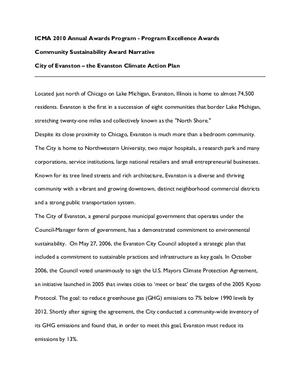 This is the 2010 nomination of Evanston, Illinois' Climate Action Plan for the Community Sustainability Award. City Manager Wally Bobkiewicz and Sustainable Programs Coordinator Carolyn Collopy are credited with aiding in the development of the this program to outline strategies to engage in more sustainable practices in order to reduce their greenhouse gas emissions by 13%.