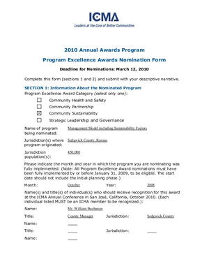 This is the 2010 nomination of Sedgwick County, Kansas' Management Model Including Sustainability Factors program for the Community Sustainability Award. County Manager William Buchanan is credited with developing a six step formal strategic decision-making process. Central to this Management Model were sustainability initiatives such as purchasing hybrid cars and putting certain applications online. Through this model, the county seeks to integrate sustainability ideals into every decision.