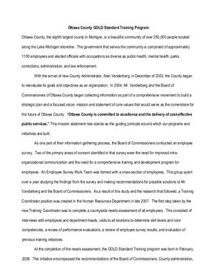 This is the 2010 nomination of Ottawa County, Michigan’s GOLD Standard Training Program for the Strategic Leadership and Governance Award. County Administrator Alan Vanderberg is credited with helping to develop the Growth Opportunities in Learning and Development (GOLD) Standard Training Program. This program was designed to provide County employees with accessible and quality training customized to the particular needs and standards of the County, resulting in a lasting program of employee development.