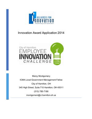 The City of Hamilton Employee Innovation Challenge (or Innovation Challenge) was created to provide a forum for innovation while encouraging idea sharing and maximizing employee experiences to improve the organization and enhance services for the community of Hamilton. The inaugural Innovation Challenge was implemented in late 2013 and we hope to sustain its success through continued annual implementation. The Innovation Challenge provides employees the opportunity to anonymously submit any idea that improves a process, addresses a challenge, or leverages an opportunity within the community.