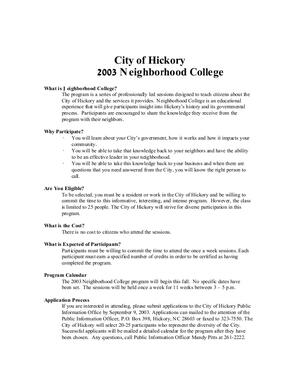 This application provides a brief overview of the city of Hickory, North Carolina, Neighborhood College, a series of professionally led sessions designed to teach citizens about the city-provided services, history, and governmental processes. Requests that applicants provide contact information and reasons for interest in the program.