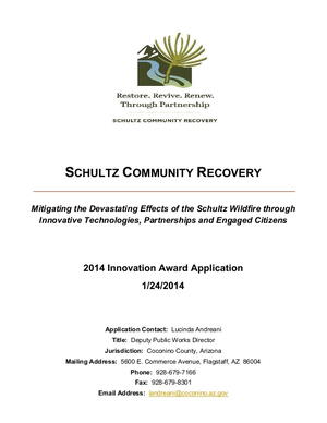 The Schultz Community Recovery (SCR) Project began almost four years ago with the goal of mitigating long-term post-wildfire flash flooding for more than 4,000 residents of an unincorporated area near Flagstaff, Arizona, who continue to be impacted by the aftermath of the 2010 Schultz Wildfire. Comprised of thousands of community stakeholders, nearly 50 local, state and federal partner agencies and organizations, and spearheaded by the Coconino County Board of Supervisors (serving as the Flood Control District), the SCR Project continues to set a standard for technological innovation and community outreach, involvement and cooperation by which other post-wildfire flash flood mitigation projects might be measured.