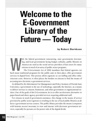 The E-Government Act of 2002 mandates that federal agencies cut back many traditional programs for the public and, in their place, offer government services in digital form. For citizens in need of government assistance, this change in the means of service provision by public sector agencies is resulting in the use of local public libraries as de facto e-government service centers.